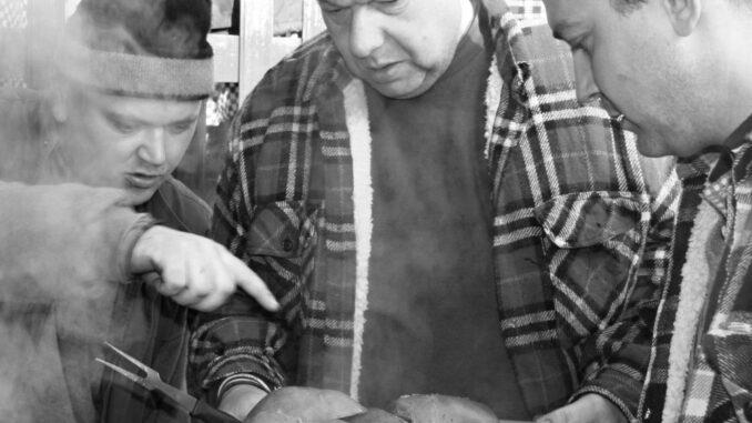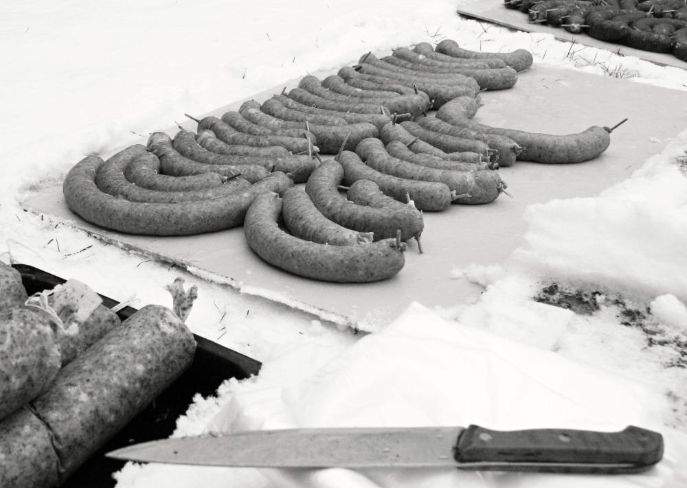 Zábava po celodenní práci pokračovala ještě drahnou chvíli. Mezitím však bylo sádlo vyškvařeno a vybráno do připravených fasek. Na stole zavoněly čerstvé oškvarky, pobídka to k novému soustu…
