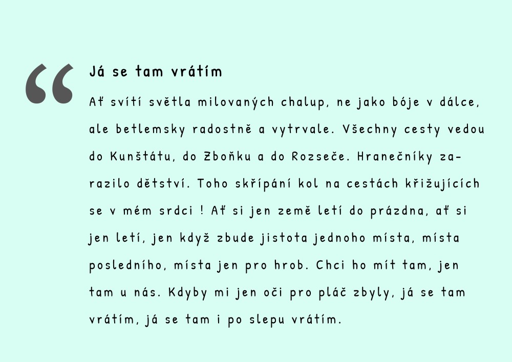 František Halas se narodil v Husovicích (dnes součást Brna), dětství prožil na Horácku. Ke kraji svého dětství věnoval básnickou skladbu Já se tam vrátím.