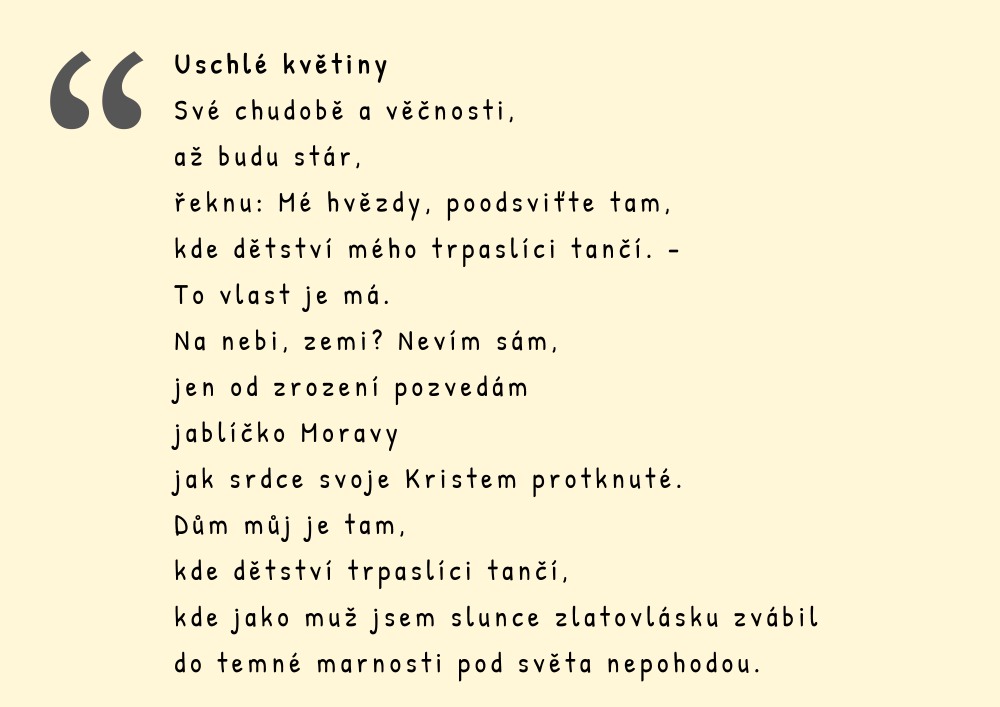 Na Moravě se narodila celá řada výborných básníků, jejichž díla patří mezi to nejcennější z naší literatury. Jak se vyznáte v jejich tvorbě? Poznejte moravské básníky podle ukázek jejich děl.