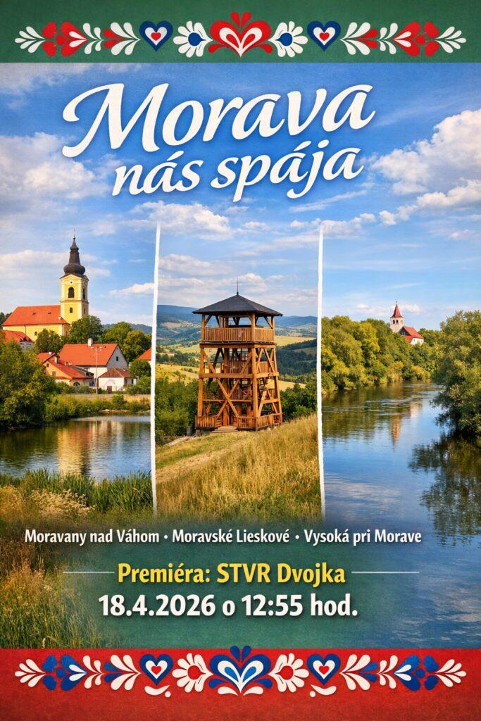 Premiéra dokumentárního filmu „Morava nás spája“ proběhne v sobotu 18. dubna 2026 od 12:55 na programu STVR Dvojka. Snímek připravila moravská národnostní menšina na Slovensku, kterou při Úřadu vlády Slovenské republiky zastupuje sdružení Morava krásna zem (MKZ).