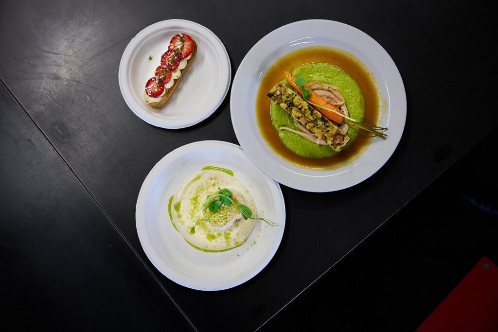Oběd začal terinou z mladého kuřete, následovala kuřecí roláda s hráškovým pyré, nádivkou a mladou karotkou. Dezert tvořilo odpalované těsto s vanilkovým krémem a jahodami. Kuchaři při přípravě kladli důraz na sezonnost surovin, včetně medvědího česneku.