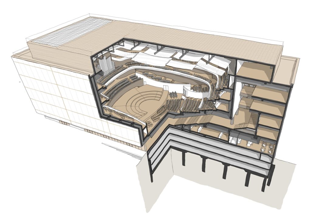 Nový Sál pro Brno, jak se projekt rovněž označuje, bude mít šest nadzemních podlaží. „Celý objekt naváže na už dokončenou etapu podzemních garáží, v nichž je připraveno 170–180 parkovacích míst. Z garáží bude možné vystoupat přímo do vstupní haly JKC. Pro diváky bude sloužit kromě samotného koncertního sálu, do jehož hlediště se jich vejde 1100–1200, také třeba kavárna; v zázemí pro zaměstnance bude většina místností určená jako tzv. ladírny, tedy šatny hudebníků, dále nahrávací studio, zkušebny, sklady apod.,“ popsal zástupce projekčního týmu Petr Hrůša.