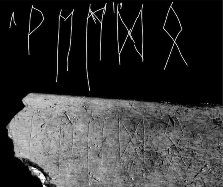 Vyryté znaky identifikoval specialista na starogermánské jazyky Robert Nedoma z vídeňské univerzity jako runy takzvaného staršího futharku. Jedná se o písmo germánsky mluvícího obyvatelstva střední Evropy mezi 2. až 7. stoletím našeho letopočtu.