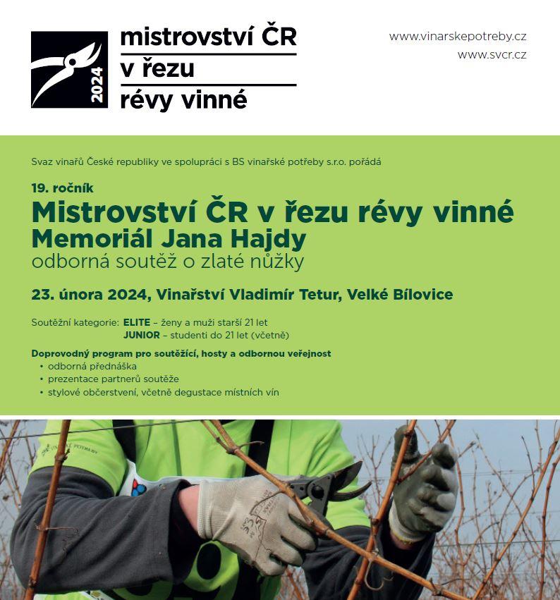 Velké Bílovice budou hostit 19. ročník Mistrovství České republiky v řezu révy vinné, známý také jako Memoriál Jana Hajdy. Soutěž se odehraje v pátek 23. února, kde se vinaři předvedou v umění řezu vinné révy. Tuto pravidelnou akci organizuje Svaz vinařů ČR ve spolupráci s firmou BS vinařské potřeby a tento rok se bude konat ve Vinařství Vladimír Tetur.