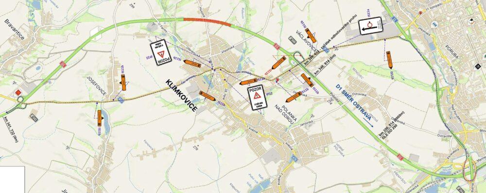 K úplnému uzavření dálnice D1 včetně tunelu Klimkovice dojde dne 27. 9. 2024 od 20:00 hod. Tato uzavírka proběhne do pondělí 30. 9. 2024 7:00 hod. Obousměrné objízdné trasy budou značeny po silnici II/647 a přes obec Klimkovice.